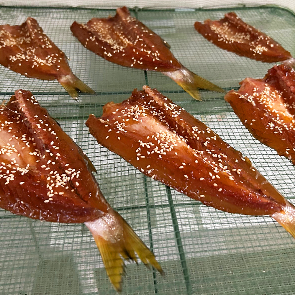何度も試作を重ねて完成させた独自の製法で、特製ダレに漬け込んだ魚を天日でじっくりと干し上げます。その日の気温や湿度、日の照り方を見極めながら干し時間を調整し、絶妙なタイミングで仕上げることで艶やかな干物が完成するのです。