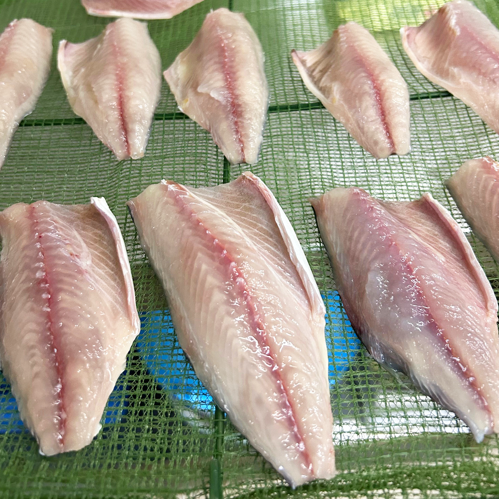 数えきれない試作を重ねて完成させたなかがわ屋独自ブレンドの「塩味」が、魚本来の旨味を引き出します。その日の気温や湿度、日の照り方に合わせて干し時間を調整し、絶妙なタイミングで干し上げることで艶やかな干物が完成。水分を適度に残したまま仕上げるので、焼き上げても身が固くならず、ふっくら柔らかな食感をお楽しみいただけます。